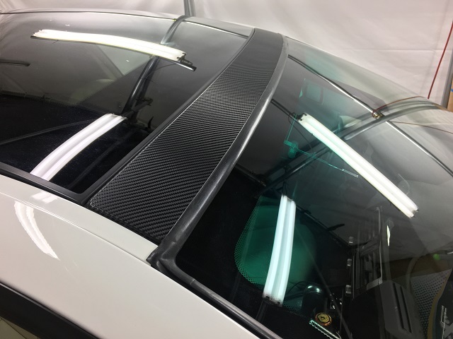 ルーフとドアミラー枠へブラックカーボン柄を施工。