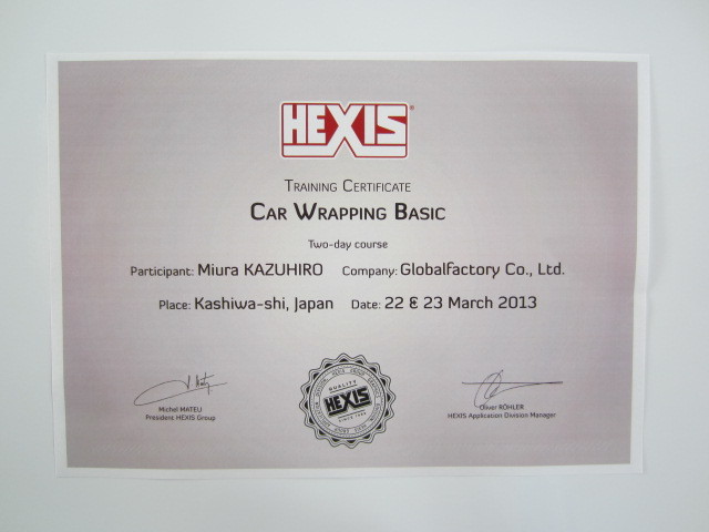 HEXIS社よりカーラッピングセミナー受講終了証が届きました。 ご立派な用紙ですな。。。 講習時の基本を忘れずに日々精進して参ります。 今後とも宜しくお願いいたします。